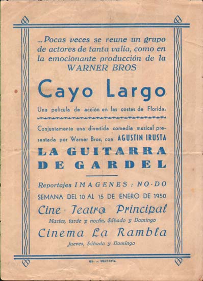 A taut classic with gangsters holed up in a hotel at the approach of a hurricane, this film marked the last pairing of Bogie and Bacall on screen. Great colour image of the lead actors from the first Spanish release in 1950, in contrast to the disappointing US material. More accurate size in inches is 4.5 x 6.25.