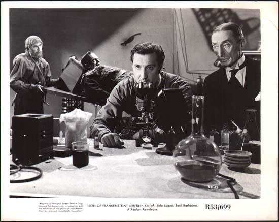 Great image showing the principal actors, with Frankenstein's son working on reviving his father's creation in the lab. An original vintage single-weight still from the Realart re-release.