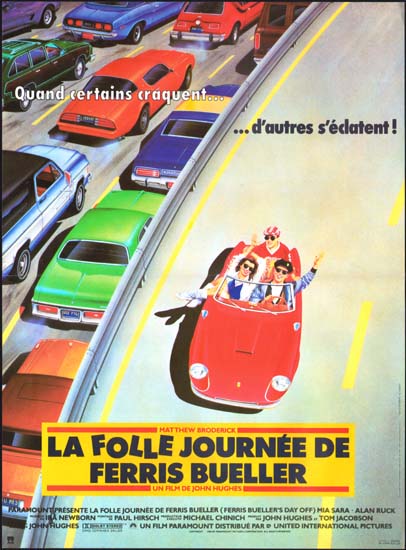 Key movie of the 80s and one of John Hughes' most popular teen comedies, now attaining cult status. Unlike the boring US domestic one sheet, this poster features the famous Ferrari 250GT Spyder California that Ferris drives into Chicago when skipping school.