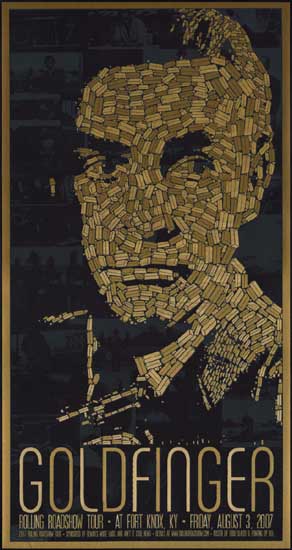 Limited edition print, originally designed for the Alamo Drafthouse Rolling Roadshow screening at Fort Knox (what a great place to show it!). This came directly from the artist and is signed and numbered 139 of 300. Amazing artwork of Connery composed of gold ingot shapes in different shades of metallic ink with scenes from the film behind.