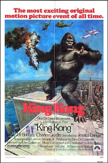 Suitably spectacular art for this updated remake of the 30s classic. Probably generates more of a chill now than it did before, as the giant ape is pictured standing astride the twin towers of the ill-fated World Trade Center in New York.