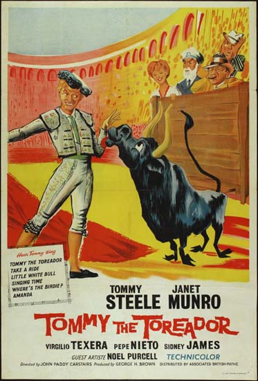 | Great cartoon style illustration. A cheery comedy vehicle for Tommy Steele, who at the time was one of a few young rock 'n' rollers being pushed as Britain's answer to Elvis, and like Elvis, eventually slipped into being more of a family-friendly all-round entertainer. Many will remember with affection the hit song "Little White Bull" that came from this movie. |