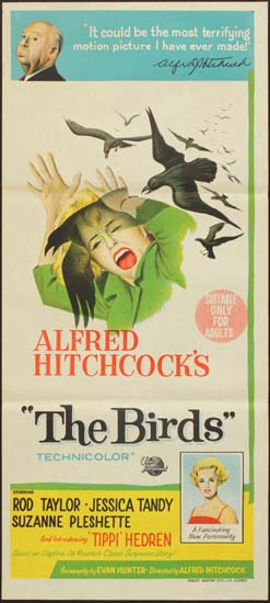 Hitchcock's classic tale of terror from the skies. Nice hand drawn litho texture (like stone litho) on this poster.