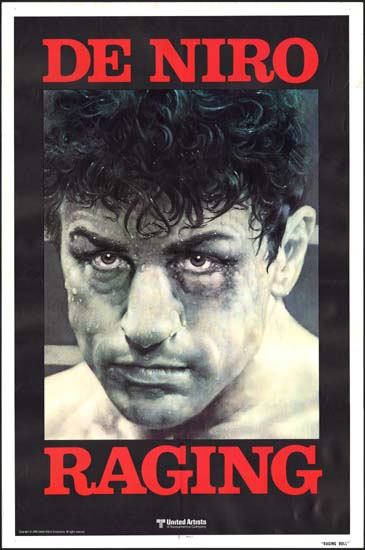 Knockout artwork of De Niro as boxer Jake LaMotta (painted portrait not photo as it might first appear), set off by the stark but ingenious tagline 'Raging'.
