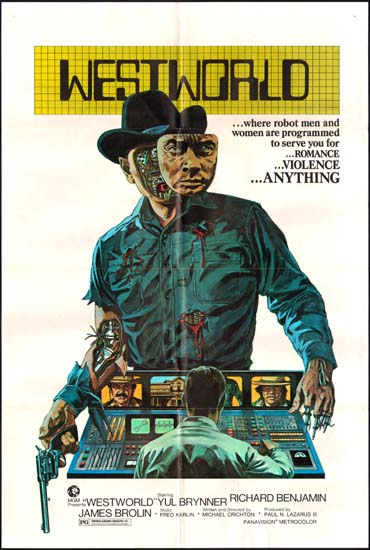 Terrific tale of technology gone mad, with the inspired casting of Yul Brynner as a relentless robot gunslinger, based on his role in The Magnificent Seven. Untypical dimensions for a 70s poster, but all of this style with a ratings box are of this size.
