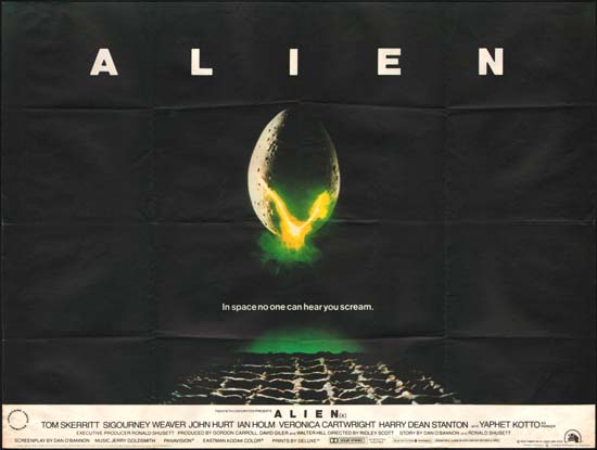 In Space No One Can Hear You Scream. A classic tagline for a classic of science fiction, and an object lesson in less is more. The disturbingly organic alien was designed by H R Giger.