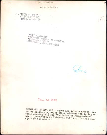 Very rare first release single-weight candid still of Valerie Hobson and Colin Clive (Dr and Mrs Frankenstein), as they sip a civilized cup of tea before reprising their roles in one of the greatest horror films ever made. From the collection of Harry Wilkinson.
