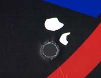 Puncture below Madonna?s eye on right leaving irregular hole approx 10mm at widest point, another 10mm circular hole punched in shoulder on right, otherwise very nice condition.