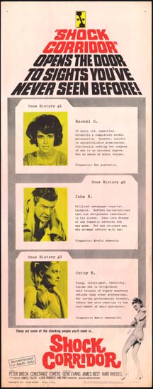 | Nicely lurid poster showing fake case history diagnoses for the inmates of an insane asylum- "Sex psychotic", "Erotic dementia", and "Manic sensualist". Sam Fuller is known for his sensationalist tabloid style, and he didn't disappoint with this cult classic. Boring it ain't. |