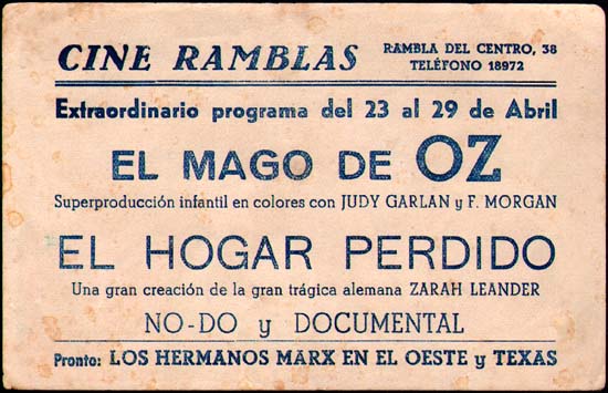 One of the all-time greats from Hollywood's golden year of 1939. Dorothy and Toto head off down the yellow brick road accompanied by the Scarecrow, the Tin Man and the Cowardly Lion and enter into film legend. Exact size of this 2-sided herald is 8.7x13.6cm.