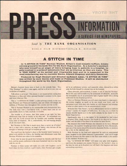 As always Norman Wisdom plays the lovable accident-prone fool who wins out over authority in the end. A masterclass in slapstick comedy, this time in a hospital setting. This 8-sided pressbook comes with a 4-sided press info supplement and a 1-sided credits supplement, all in superb condition. Additional images can be provided on request.