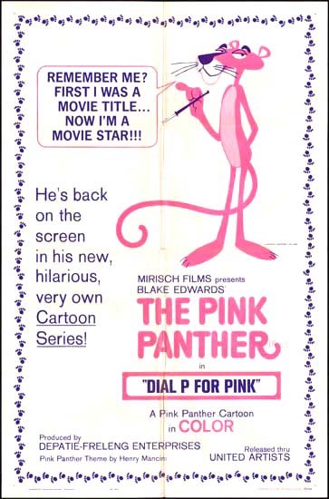 Rare cinema poster for one of the early Pink Panther shorts. These were inspired by the popularity of the character in the opening animated titles to the original live action Pink Panther. That Pink Panther was of course really the name of a priceless diamond.