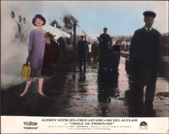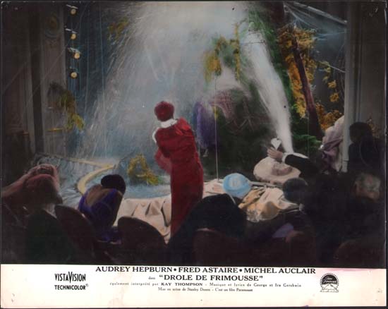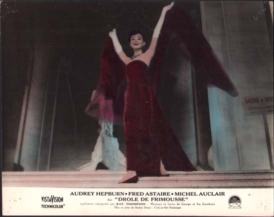 Audrey arrives in Paris, but the fashion show doesn't quite turn out as planned. Glossy, hand-tinted, thicker card stock than later French lobbies. More accurate size is 9.125x11.5 inches.
