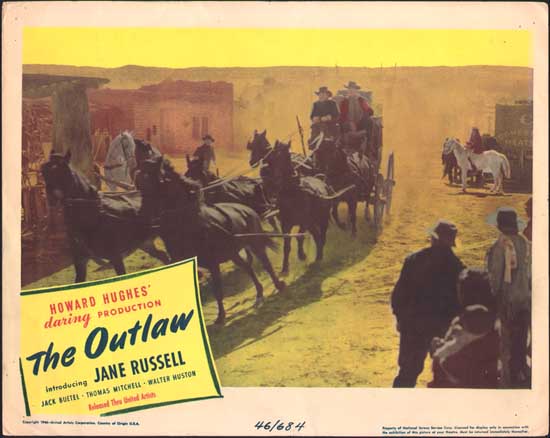 The stagecoach rides into town. This card is from the first general release in 1946, having been famously withdrawn after one week in 1943 due to censorship violations (i.e. Jane Russell's rather prominent bosom).