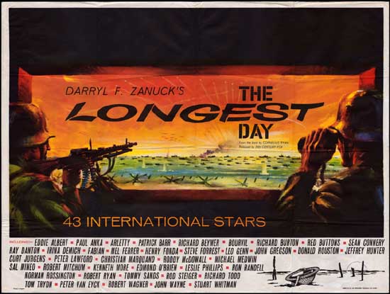 | One of the most desirable quads of any decade, perfectly exploiting the horizontal format to encapsulate the D-Day beach landings. Although this is a 1st release poster (re-release has Gert Frobe's name), dates on the back reveal it was reshown in 1964 & 1966, no doubt to recoup the losses incurred by Cleopatra that famously almost sank the studio. |