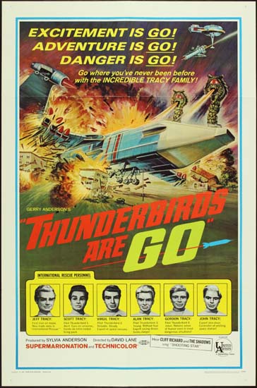 | 5..4..3..2..1.. Gerry Anderson's International Rescue puppets hit the big screen, with Virgil, Scott, Brains, Lady Penelope, Parker and co. Even Cliff Richard and The Shadows make an appearance. Thunderbird 1 and Thunderbird 5 can be seen in the top corner of this poster. |