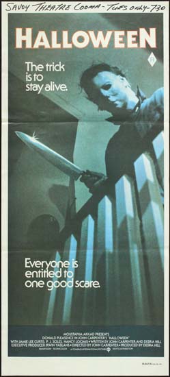This is the image that collectors look for - the one showing Michael Myers - only available on the Australian posters. In an almost accidental homage to Psycho, Carpenter's landmark horror gave a first big screen credit to Jamie Lee Curtis, daughter of Janet Leigh.