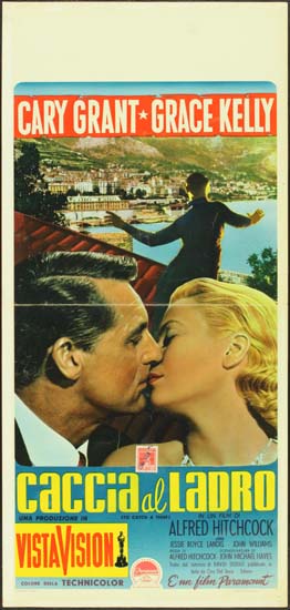 | Lovely portrait shot of Cary and Grace with Monte Carlo in the background. This locandina is practically identical to the first release poster, even down to the printer, and is almost always sold as such; however the first release has "Ottobre 1955" (October 1955) printed in the bottom right corner. Regardless of the year of release, though (the tax stamp shows this one was last used in 1967), it's an exceedingly difficult title to find in this format. |
