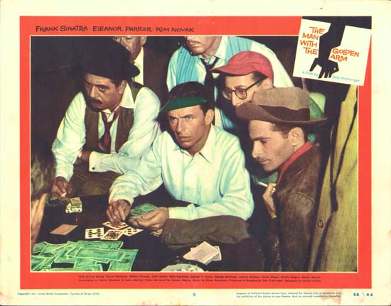 Great shot of Sinatra succumbing to another vice besides the drugs that form the main theme of the movie. Saul Bass' famous design adorns the border.
