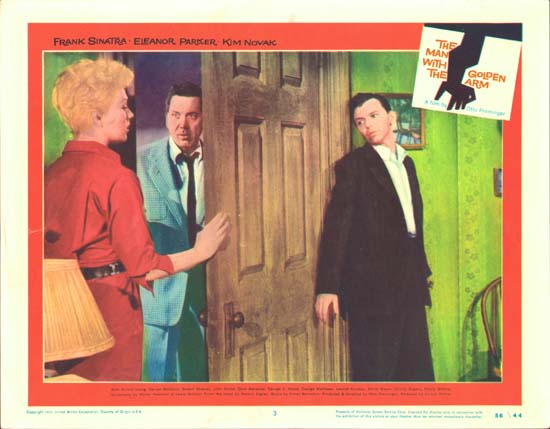 Novak helps Sinatra hide out and go cold turkey in her apartment. Iconic border logo by Saul Bass.