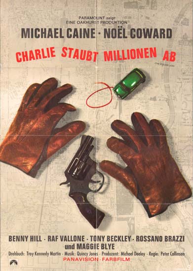 Hang on lads, I've got a great idea. Unusual but impressive poster artwork distilling the film into a few visual clues. Michael Caine plus Minis equals all-time British classic.