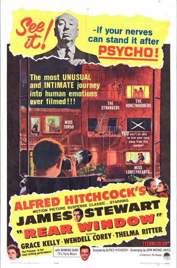 A masterpiece amongst masterpieces from Hitchcock. As can be seen, this poster was issued to capitalize on the phenomenal success of Psycho, but also exploits Grace Kelly's intervening rise to royalty and Burr's TV success as Perry Mason. Many people prefer this image to the muted and very expensive 1st release.
