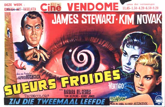 Scarce original poster from Belgium. The only first release poster of which we are aware that shows the two incarnations of Kim Novak in a suitably ghostly fashion. The giant swirling eye mirrors Saul Bass' opening title sequence.