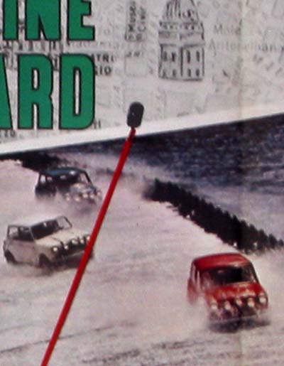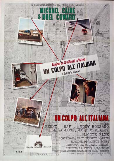 What more suitable than some great Italian paper on the Italian Job? Huge poster with a clever design based on the British Quad, using a streetmap of Turin as a crime investigation board. Complete with photos of - you guessed it - those minis.